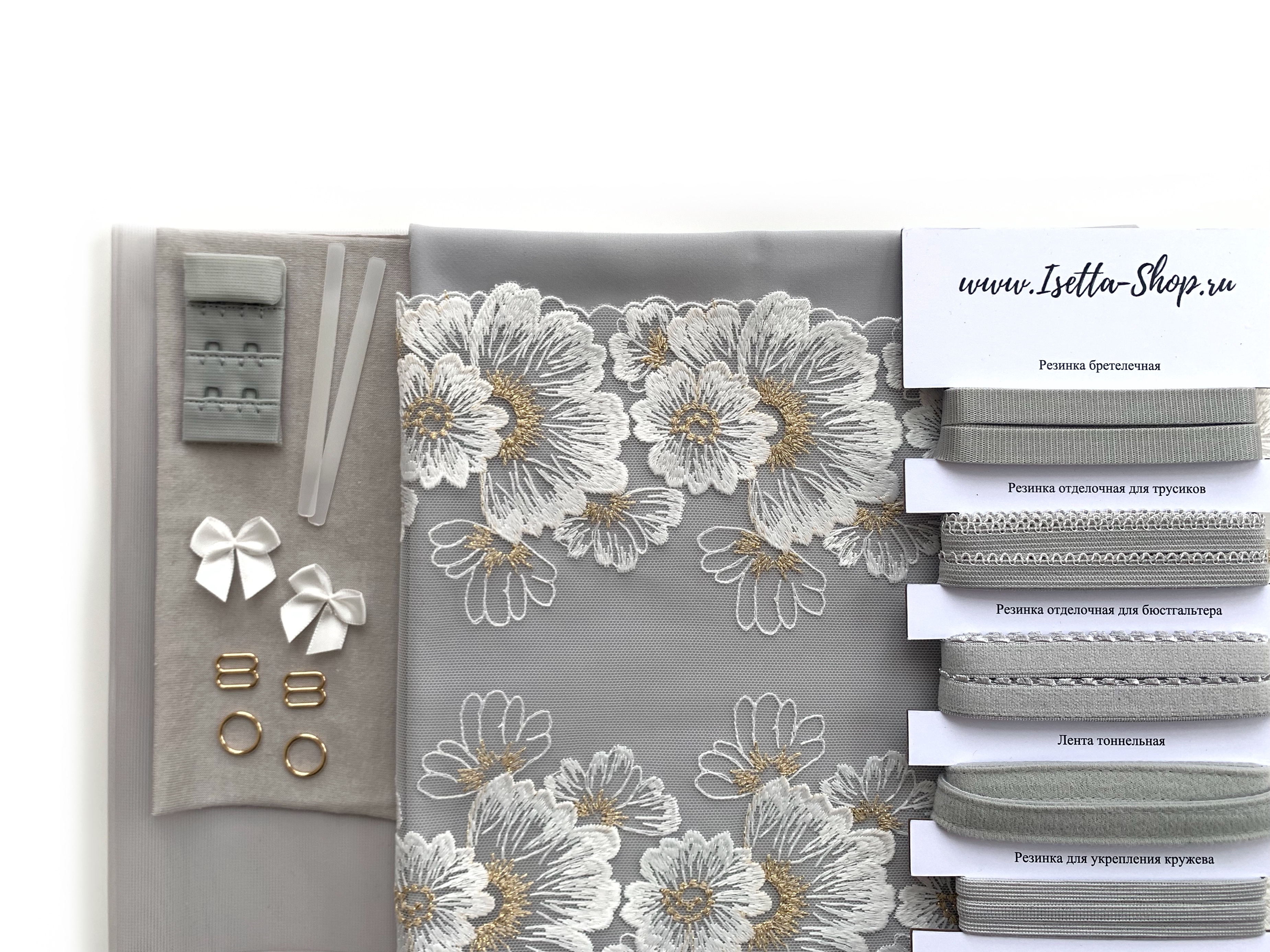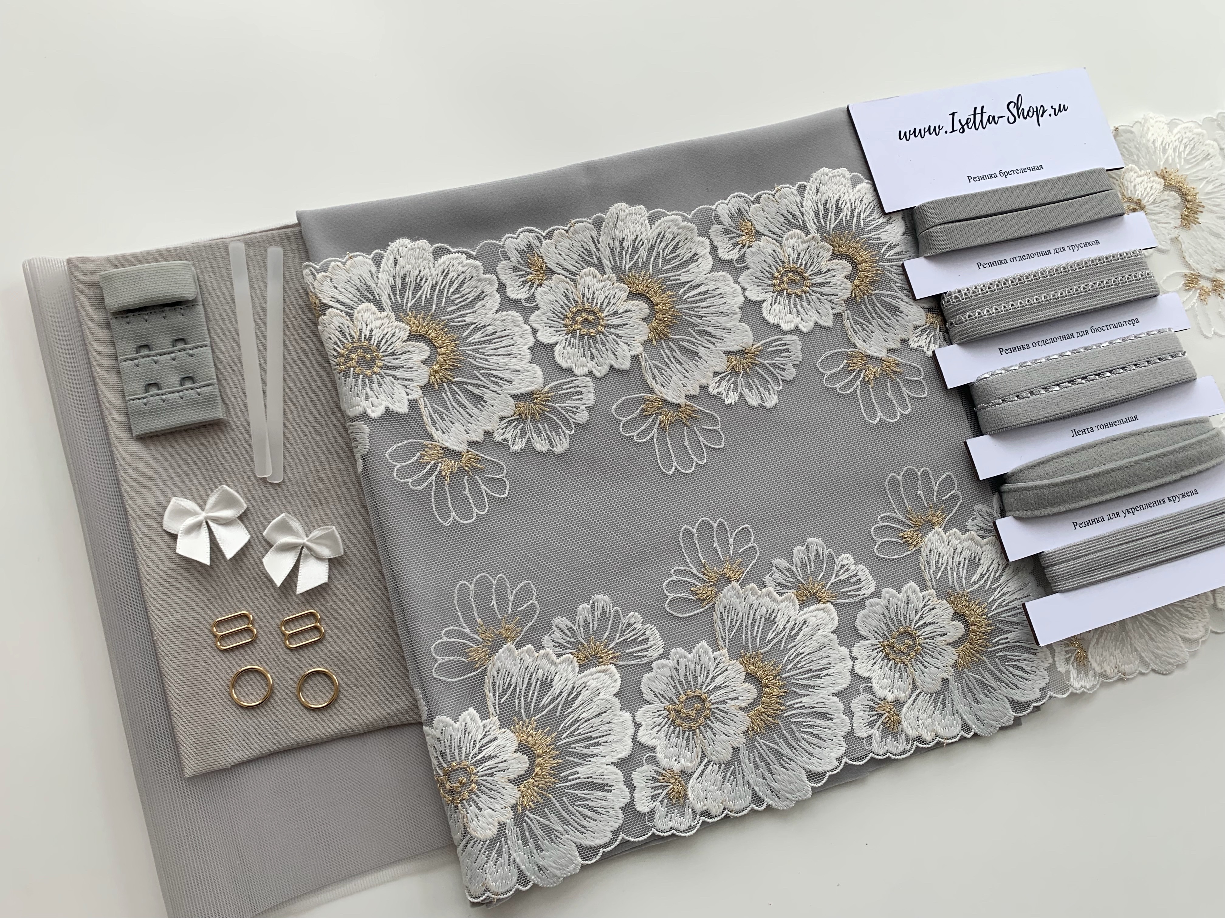 В набор входит все самое необходимое для пошива одного бюстгальтера и трусиков. Вам останется только выбрать каркасы.