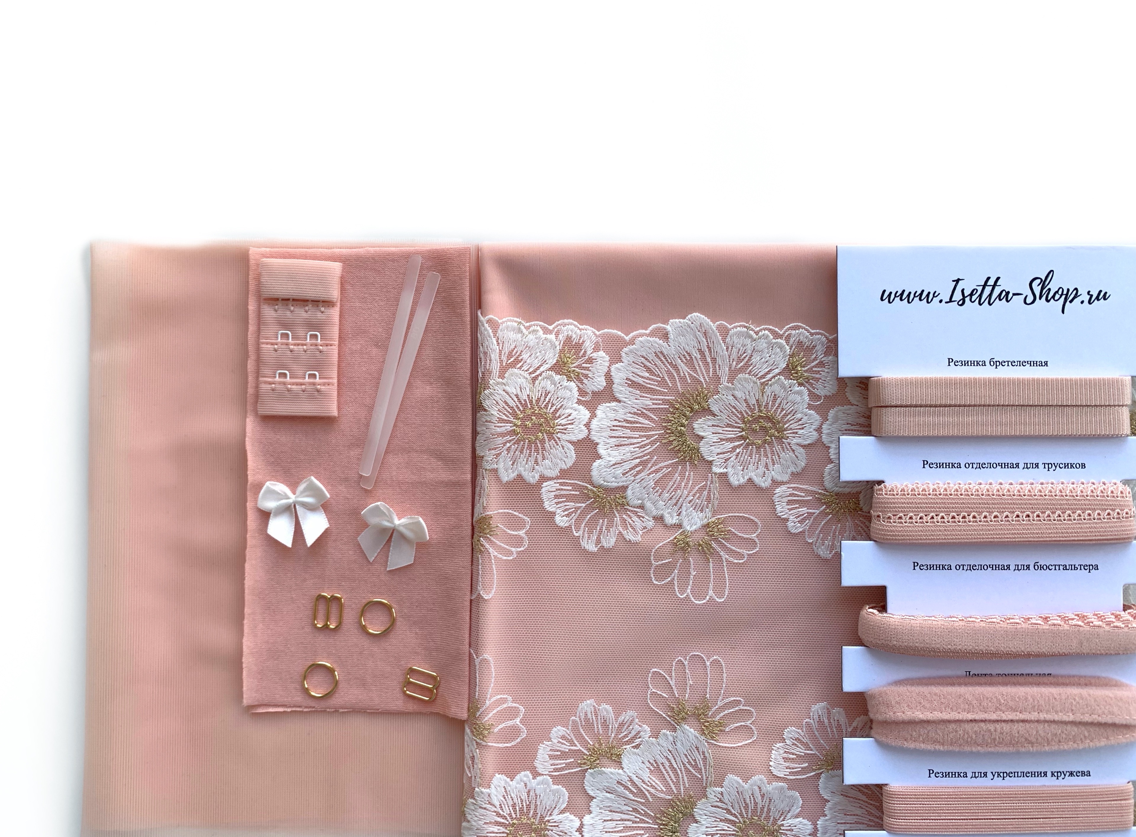 В набор входит все самое необходимое для пошива одного бюстгальтера и трусиков. Вам останется только выбрать каркасы.