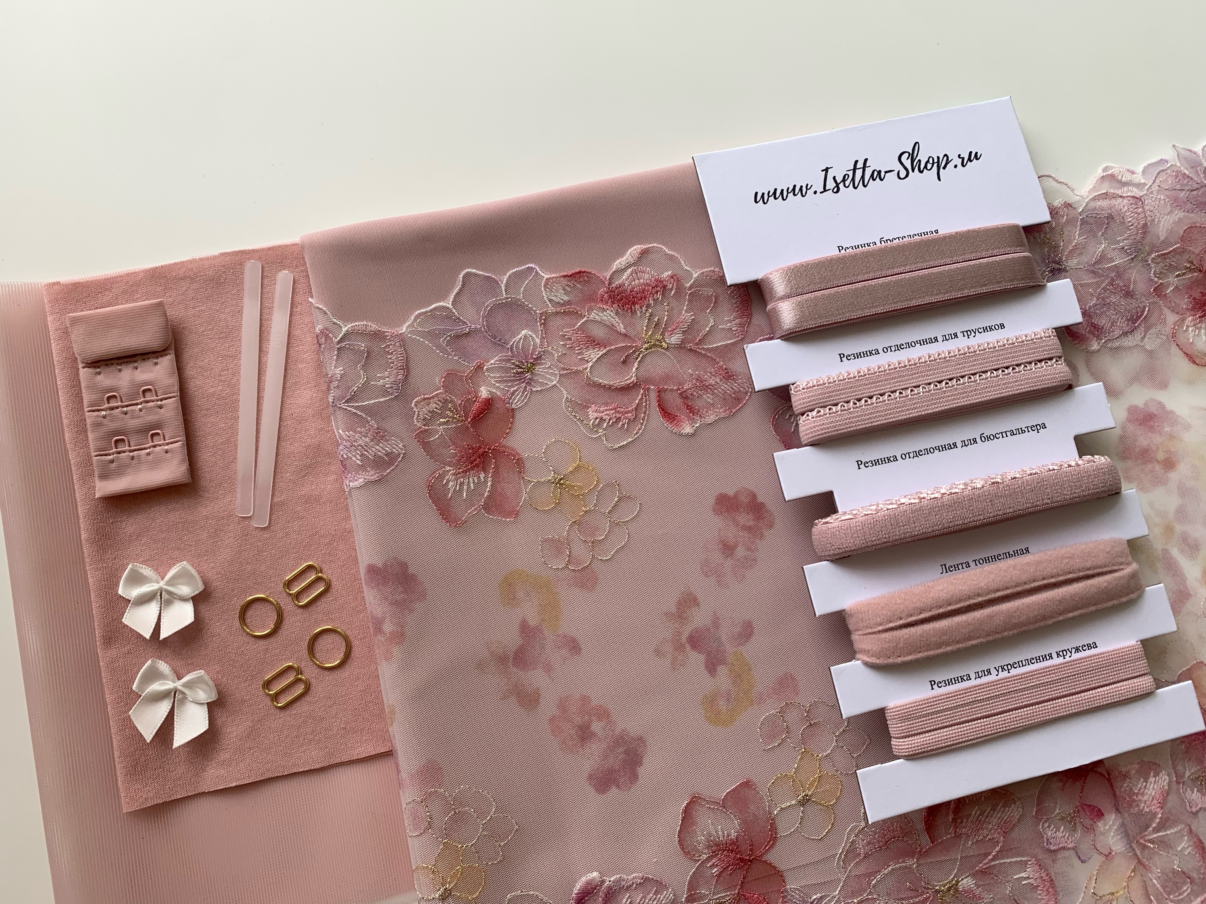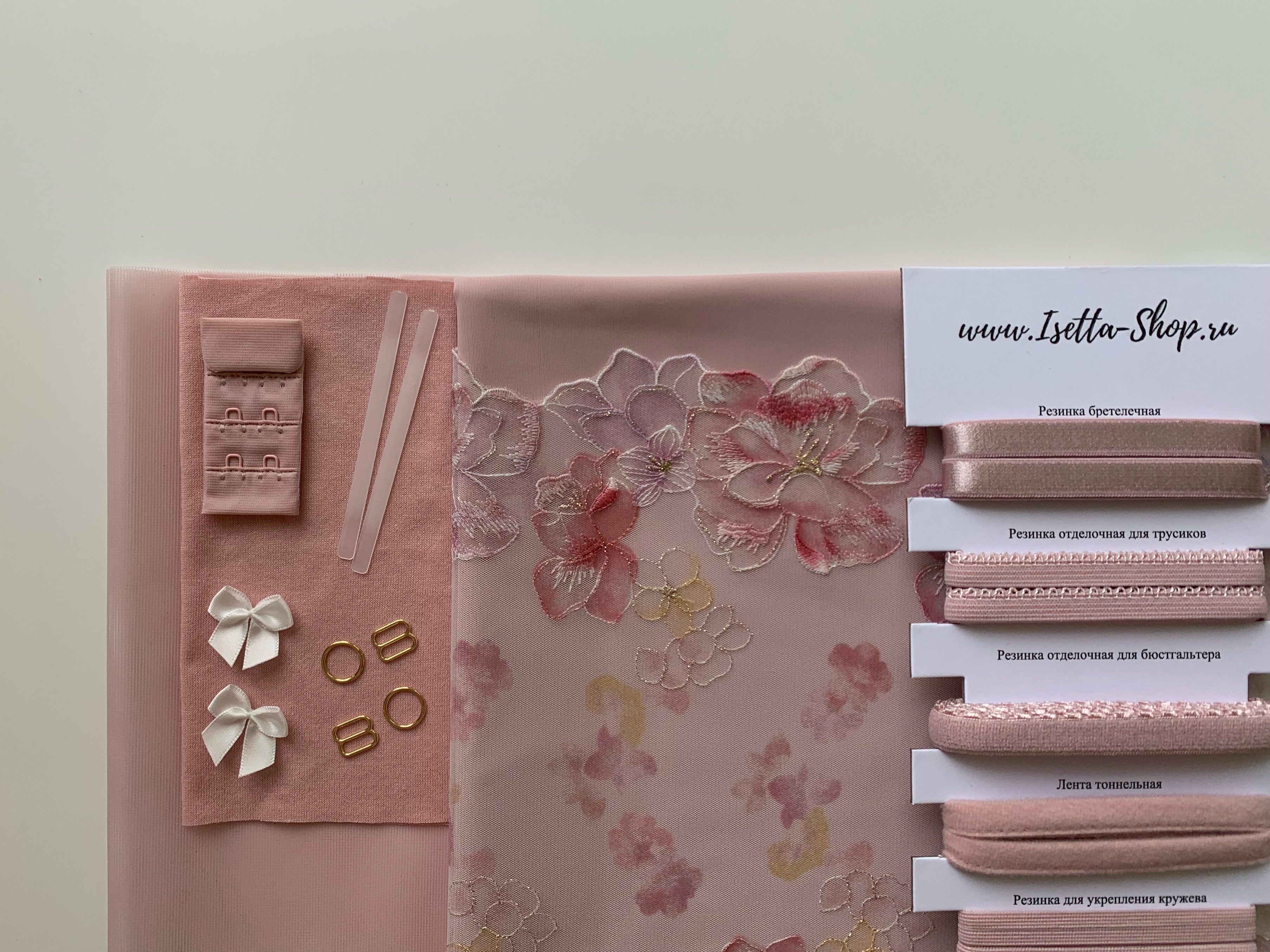В набор входит все самое необходимое для пошива одного бюстгальтера и трусиков. Вам останется только выбрать каркасы.