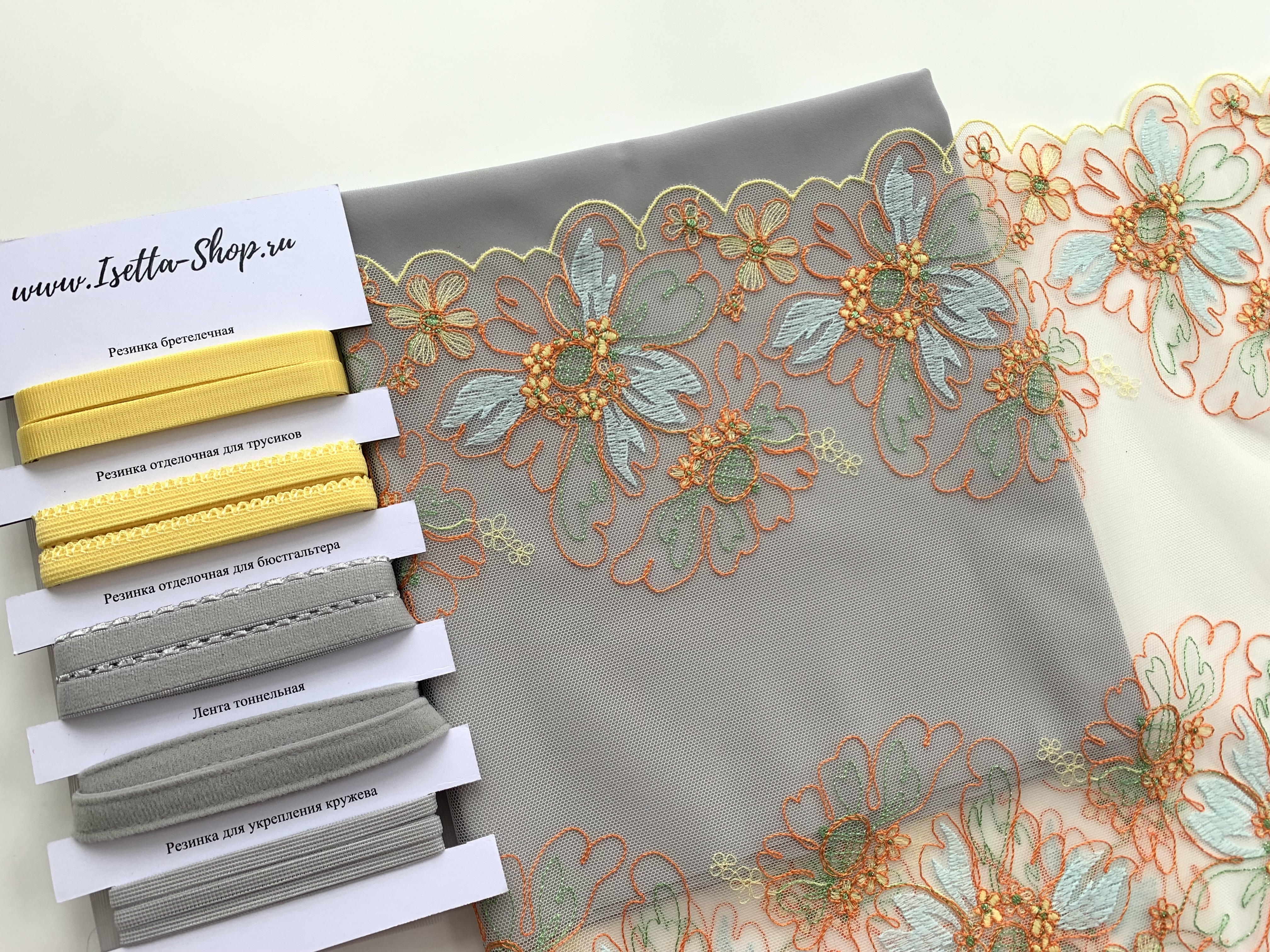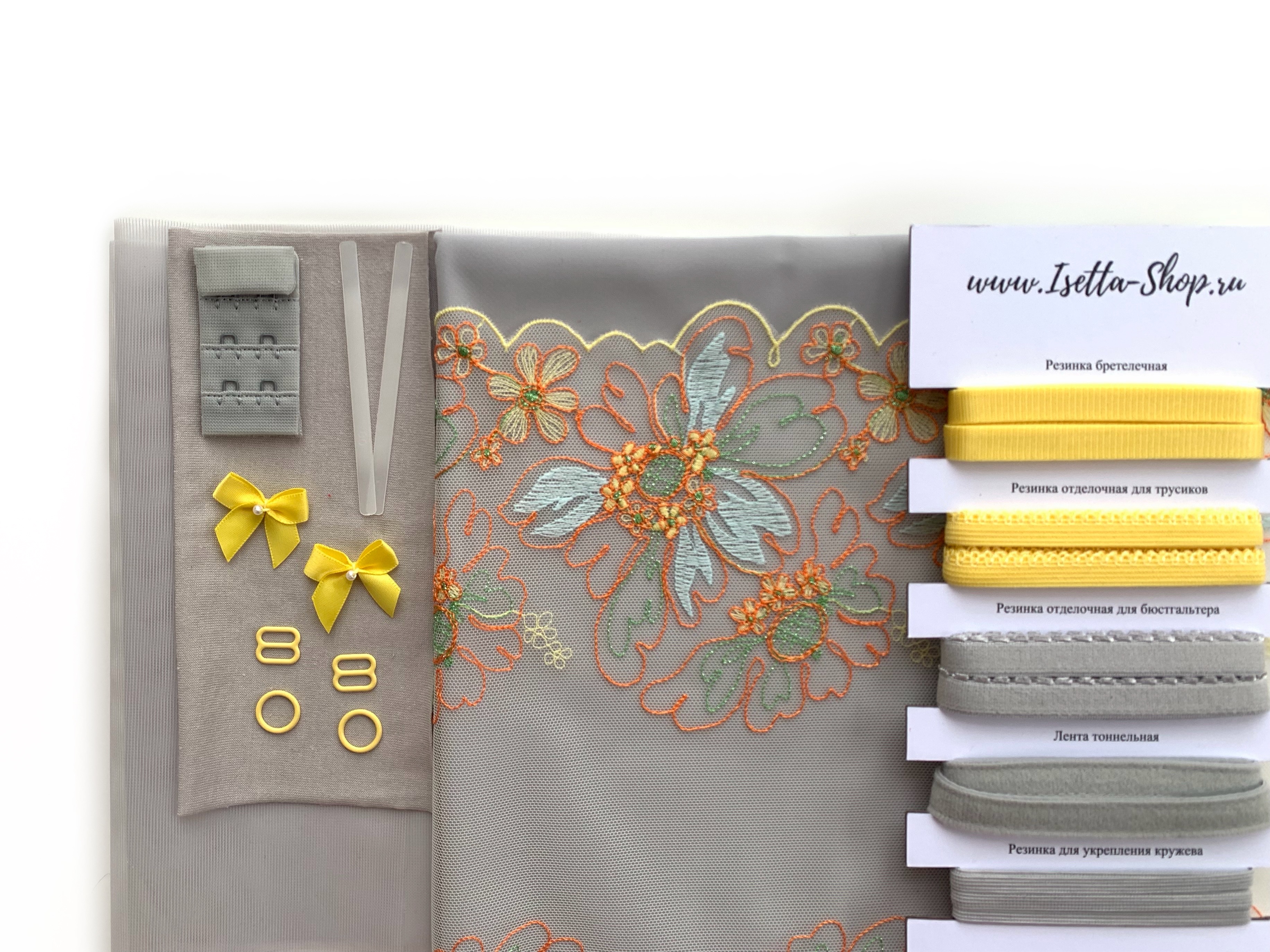 В набор входит все самое необходимое для пошива одного бюстгальтера и трусиков. Вам останется только выбрать каркасы.