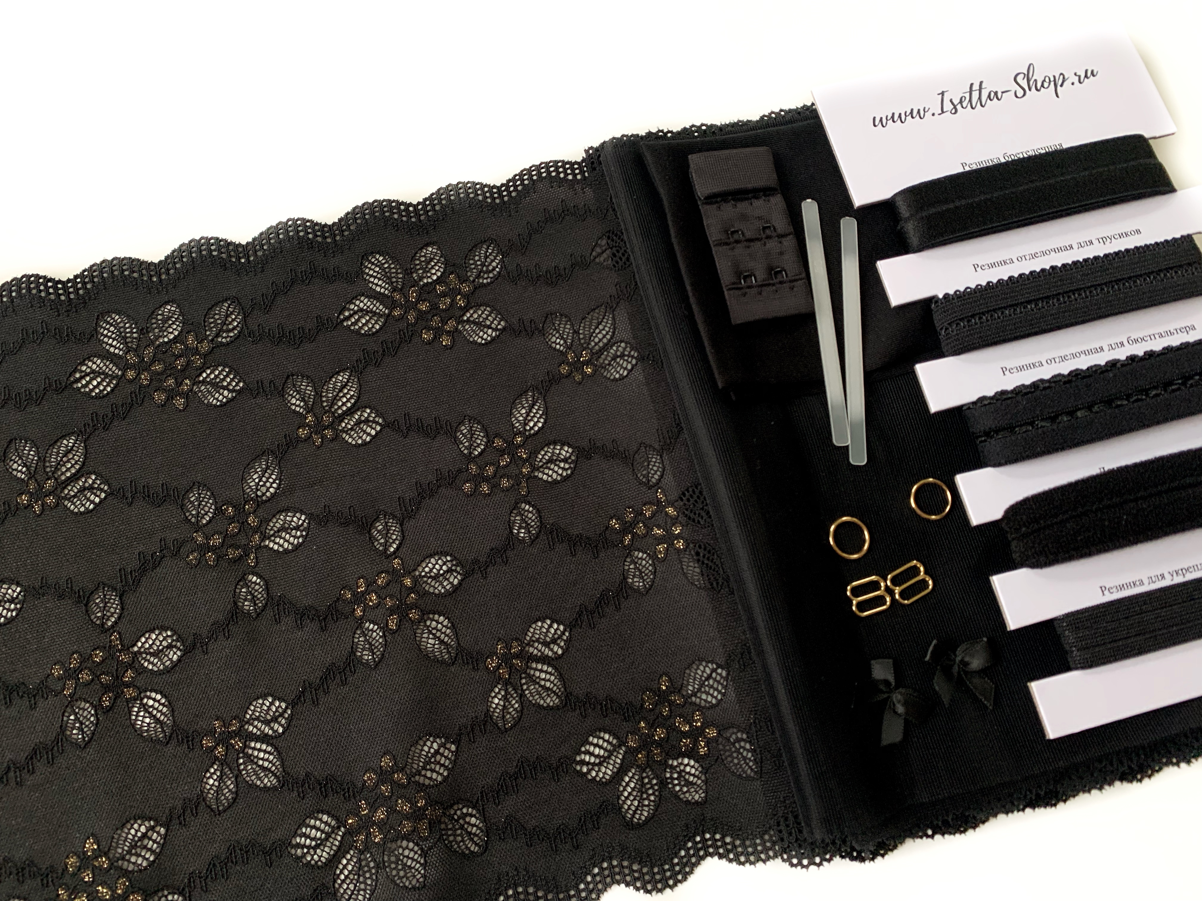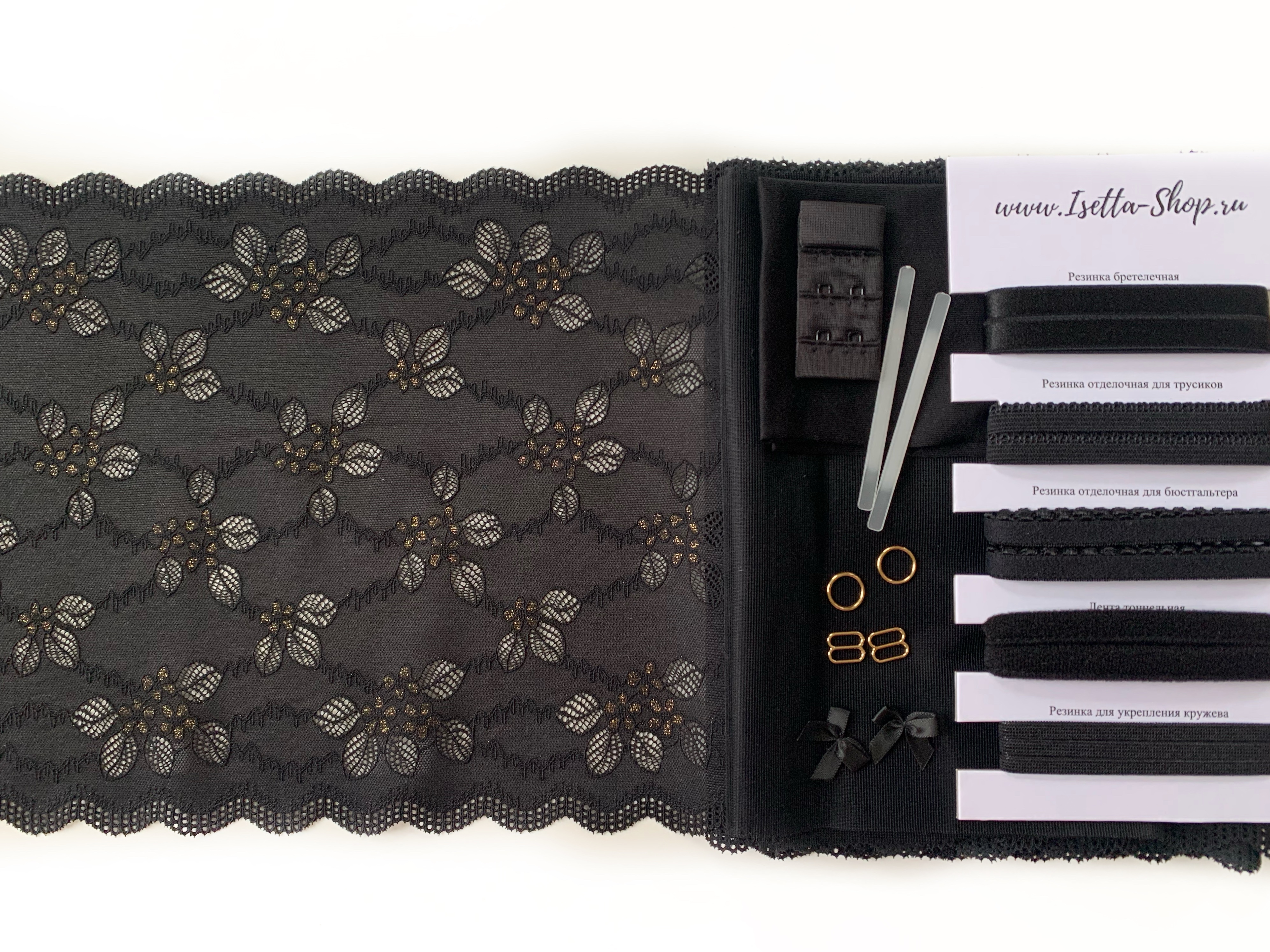В набор Isetta кружевной черный/золото входит все самое необходимое для пошива одного бюстгальтера и трусиков из кружева.